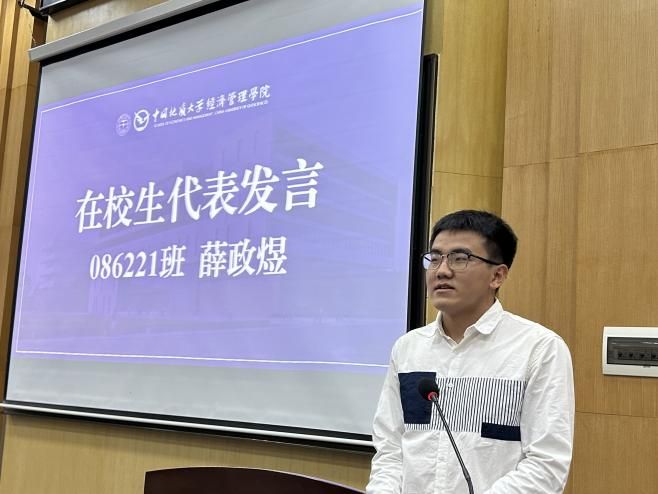 在校生代表、2022级信息管理与信息系统专业薛政煜分享了自己的成长经历。他以“专注”“尝试”“担当”三个关键词,讲述了自己从迷茫到明晰的心路历程,并鼓励新生们主动融入环境、善用校园资源、勇于在集体中锻炼自我。