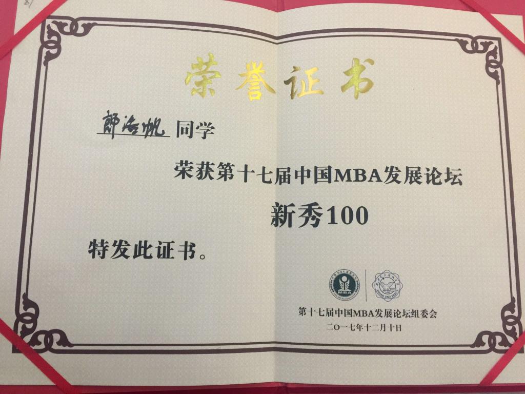 2016级MBA学员郎浩帆同学因其创立的“武汉众恒星”广告公司而在本次活动中被评为“中国MBA新秀”,这个奖项的评选,旨在表彰那些具有创新能力、潜质非凡、才华初露的在校MBA 同学,期望他们在校学有所成,毕业后建功立业。