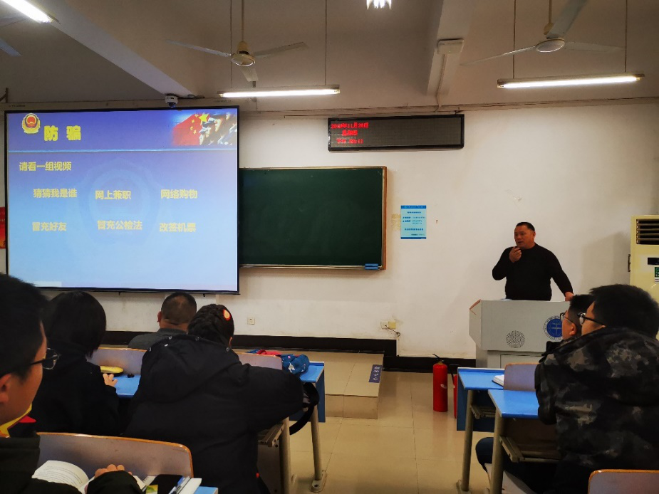 保卫处副处长单红峰作题为《老员工安全警示教育》的宣讲。他从防盗和防骗两个方面出发,提醒同学们应该提高防范意识,避免被盗与被骗情况发生。单处长的语言风趣幽默,用身边的案例说明问题,同学们表现积极,现场气氛融洽。