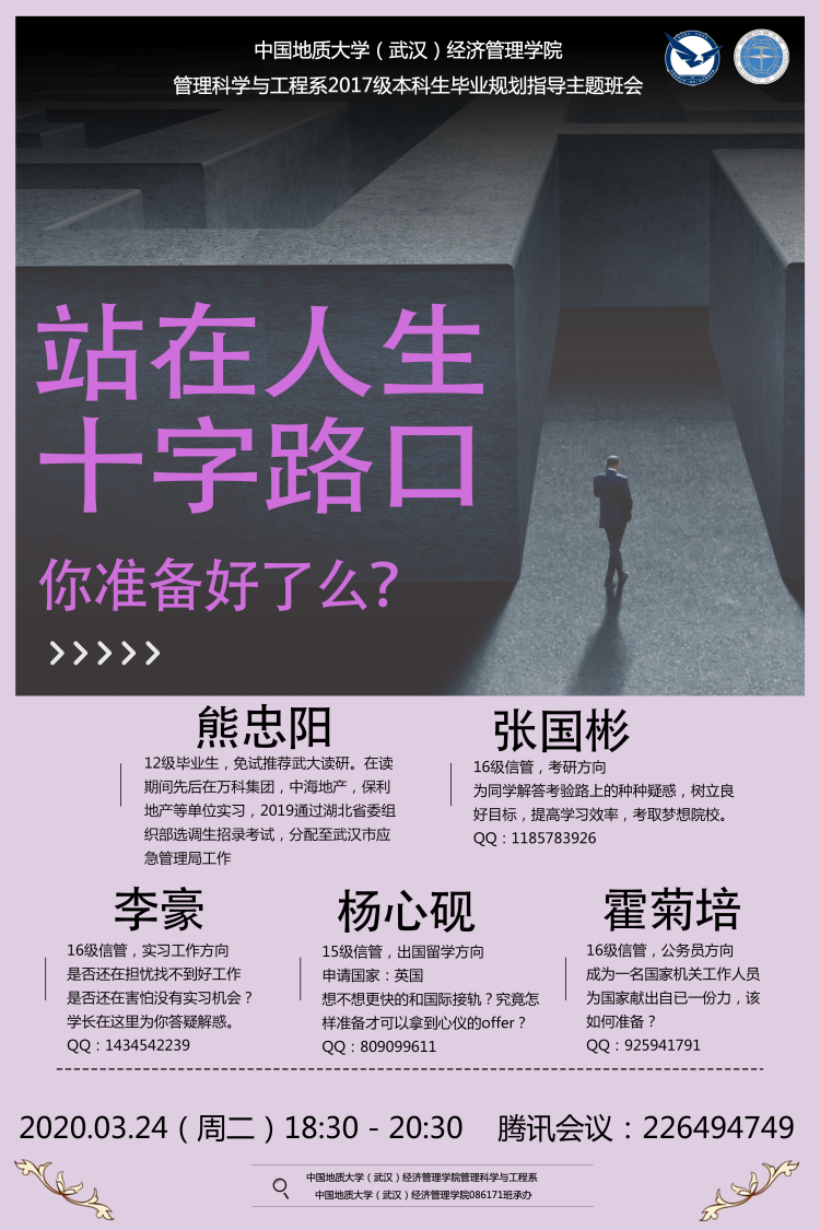 为帮助2017级本科生尽早确定毕业规划,做好学业规划,3月24日晚,管理科学与工程系召开2017级本科生线上毕业规划指导会。会议由管科系系主任、086171班班主任王广民老师设计与组织,管科系支部书记、089171班班主任孙涵老师,089172班班主任柯小玲老师,086172班班主任李龙锡老师,管科系辅导员徐媛老师以及管科系2017级110位员工参加了会议。管科系五位优秀学子熊忠阳、张国彬、李豪、杨心砚、霍菊培受邀参加。会议由086171班班长张冰主持。