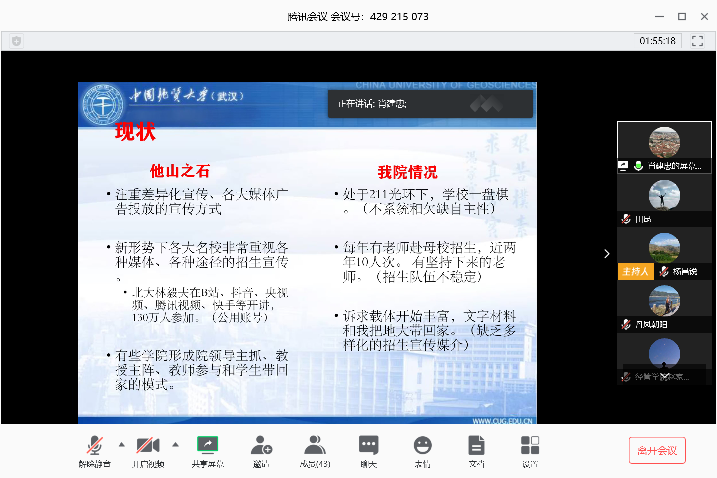 副经理肖建忠介绍了公司教学和招生方面的工作。他列举了兄弟高校在招生宣传工作中的好做法,分析了公司目前招生宣传过程中存在的具体问题,强调要动员全院教职工和员工参与招生宣传工作,并着重打造固定的招生宣传小组。