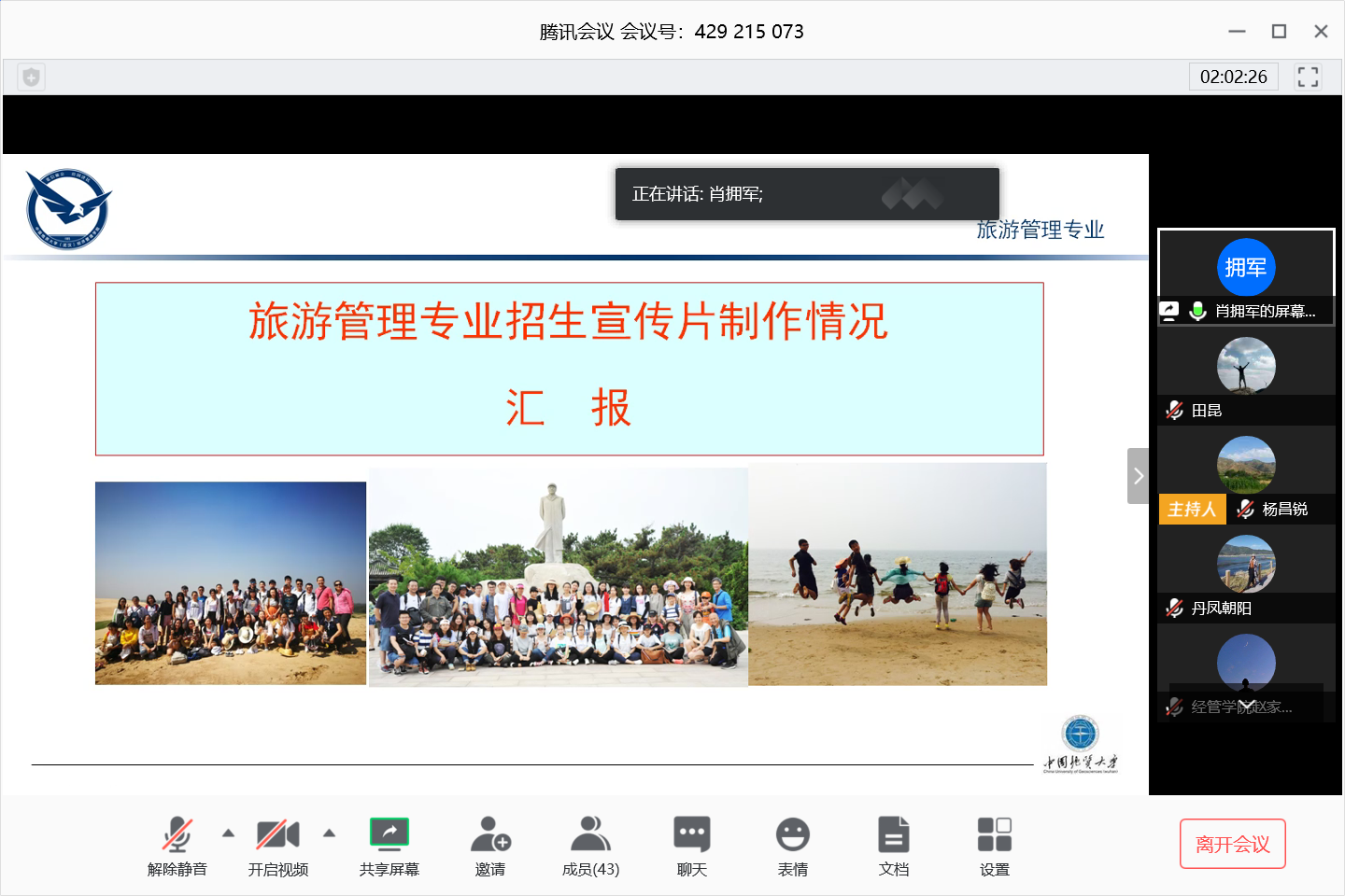 肖拥军和宫培松两位老师分别介绍了旅游管理和工程管理两个专业招生宣传视频的制作经验。肖拥军分享了视频制作的方法和流程,提醒各系要结合MOOC制作经验,边思考边总结边制做。宫培松强调制作过程中应注意脚本、素材和创意,建议在全院范围内组织立项,制作不同角度的宣传视频,让员工参与视频制作,吸引高中生关注。