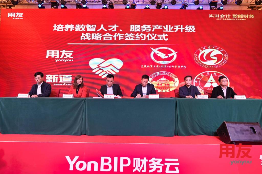 (通讯员:高永洁)4月27日,由党委书记杨昌锐带队,肖建忠副经理,杨洁教授,李月娥教授,叶新宇老师和马莉丽老师一行五人,受邀前往洪山宾馆,参加用友公司举办的“实时会计智能财务”2021企业数智化财务创新峰会,并在上午的主题大会上,与用友网络、用友新道进行了“ 培养数智人才、服务产业升级”的战略合作签约仪式。