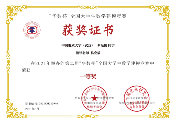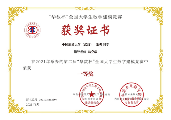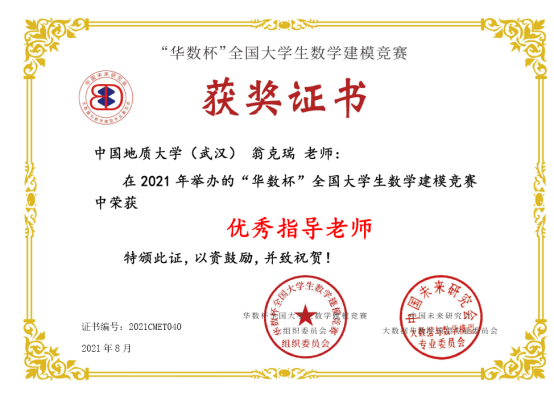 2021年第二届“华数杯”全国老员工数学建模竞赛于2021年8月5日-8日举行,本次竞赛共吸引2189支队伍参赛,竞赛专家组经过初评、网评、会评和复审四个阶段的评审,评选出一等奖184支,二等奖370支,三等奖550支。公司翁克瑞老师带队的2支队伍获一等奖,1支队伍获二等奖:李林森、 张爽、李佩的队伍获一等奖;刘林凯、尹艳悦、 程浩鋆的队伍获一等奖;潘信、郑咏杰、裴璇子的队伍获二等奖。此外,公司贲雅雯同学的队伍在数理公司付丽华老师带队下获三等奖。翁克瑞老师被评为 “优秀指导老师”。