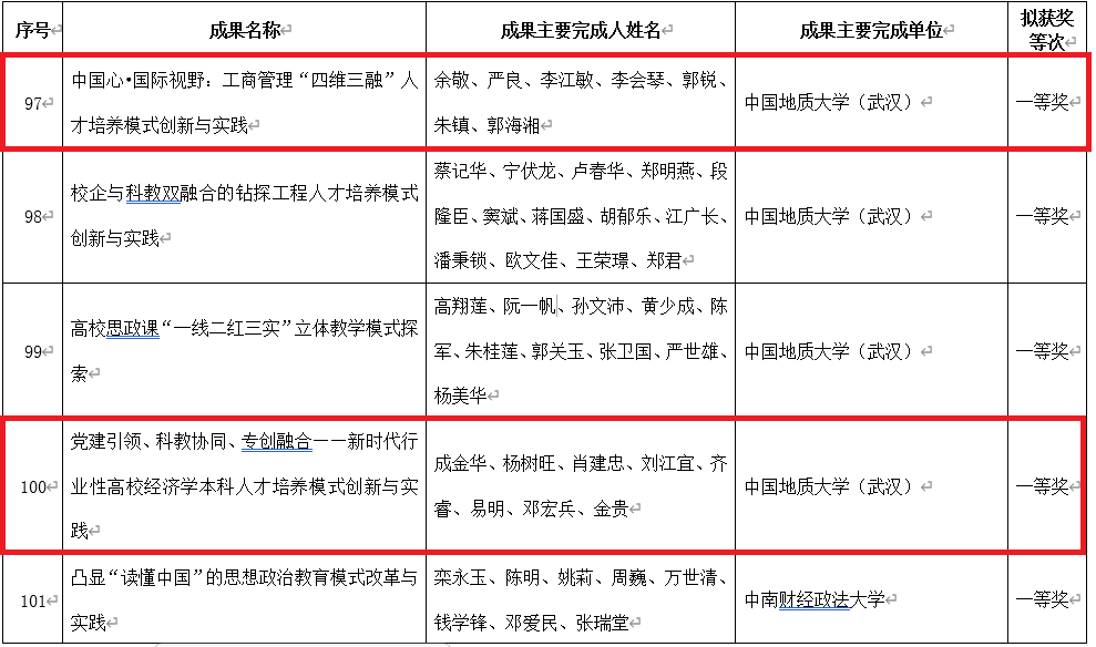 近期,经过第九届湖北省高等公司教学成果奖评审委员会的严格评审和为期一个月的结果公示,公司由余敬教授主持的《中国心•国际视野:工商管理“四维三融”人才培养模式创新与实践》和由成金华教授主持的《党建引领、科教协同、专创融合——新时代行业性高校经济学本科人才培养模式创新与实践》两个项目分别荣获湖北省高等公司教学成果一等奖。