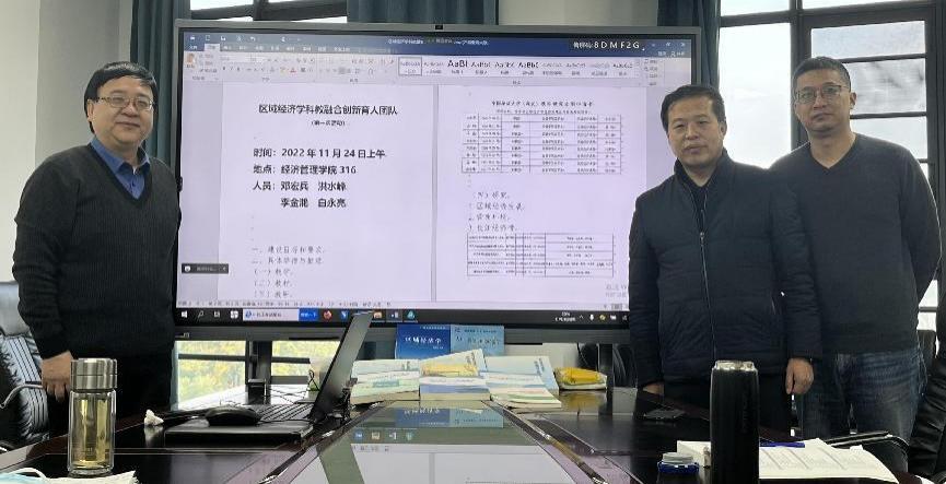 团队负责人邓宏兵教授从建设目标和要求、具体举措与推进两个方面做了发言。他认为作为基层教学组织单位,团队当前的核心任务是:立足教学,做好教研,推进融合。首先要把课上好,打造精品课程;其次是要做好教研工作,按质按时完成教研项目;第三,结合课程做好研究工作,聚焦区域经济发展、营商环境、长江经济带开展相关研究。团队计划以国家五年规划教材《人口资源环境经济学》及21世纪高等院校教材《区域经济学》的修订修编为抓手,推动国家级高水平教材建设工作。白永亮、洪水峰、李金滟老师分别围绕员工参与科研项目申报、思政融入本科课堂教学、教研结合等做了发言。