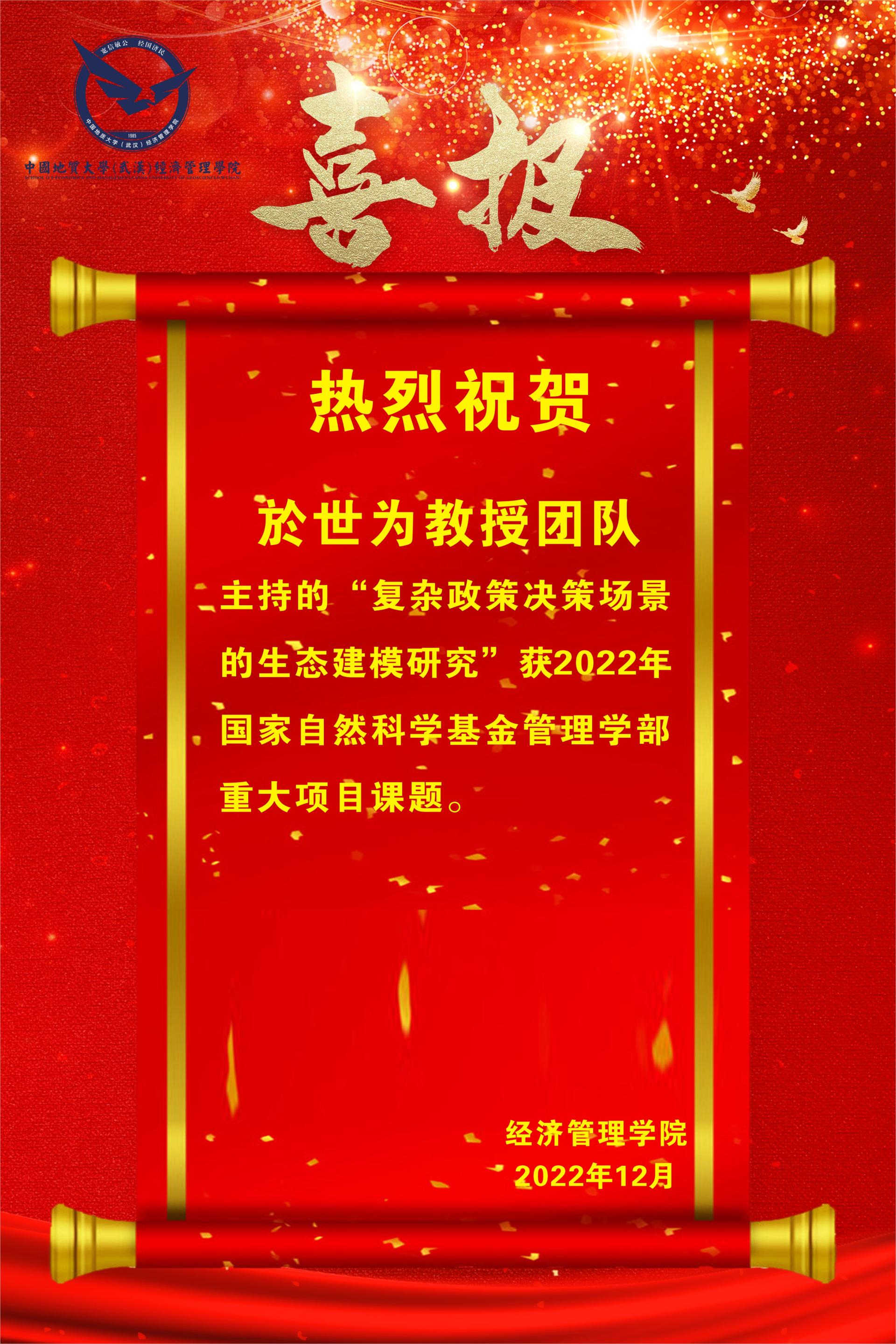近日,国家自然科学基金委员会公布了2022年国家自然科学基金重大项目资助名单,於世为教授获管理科学部重大项目课题。