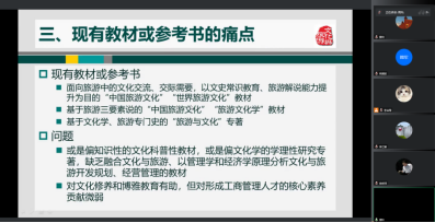 “文化与旅游”教学团队负责人周玲老师从课程基本情况、教学实施与反馈、教材编写三个方面进行了汇报。“文化与旅游”课程是公司2019版工商大类学科本科培养计划中的学科基础课,2020年至今开课3轮。周玲老师分别从教学内容与环节、教学方法、课程教学环节与考核总结教学经验,分析目前存在的问题,提出可行的完善措施;并针对下一步课程教材编写重难点内容和进度计划进行安排。