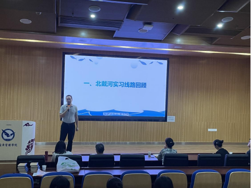 第一环节为北戴河旅游教学实习总结。肖拥军老师带领大家一起回顾了北戴河实习线路和内容,并着重突出了长城文化线路的教学内容,在旅游地学及旅游资源教学线路中,着重回顾了花岗岩的球形风化、海岸岩石种类及其成因,还有一代伟人毛主席在北戴河留下的足迹。