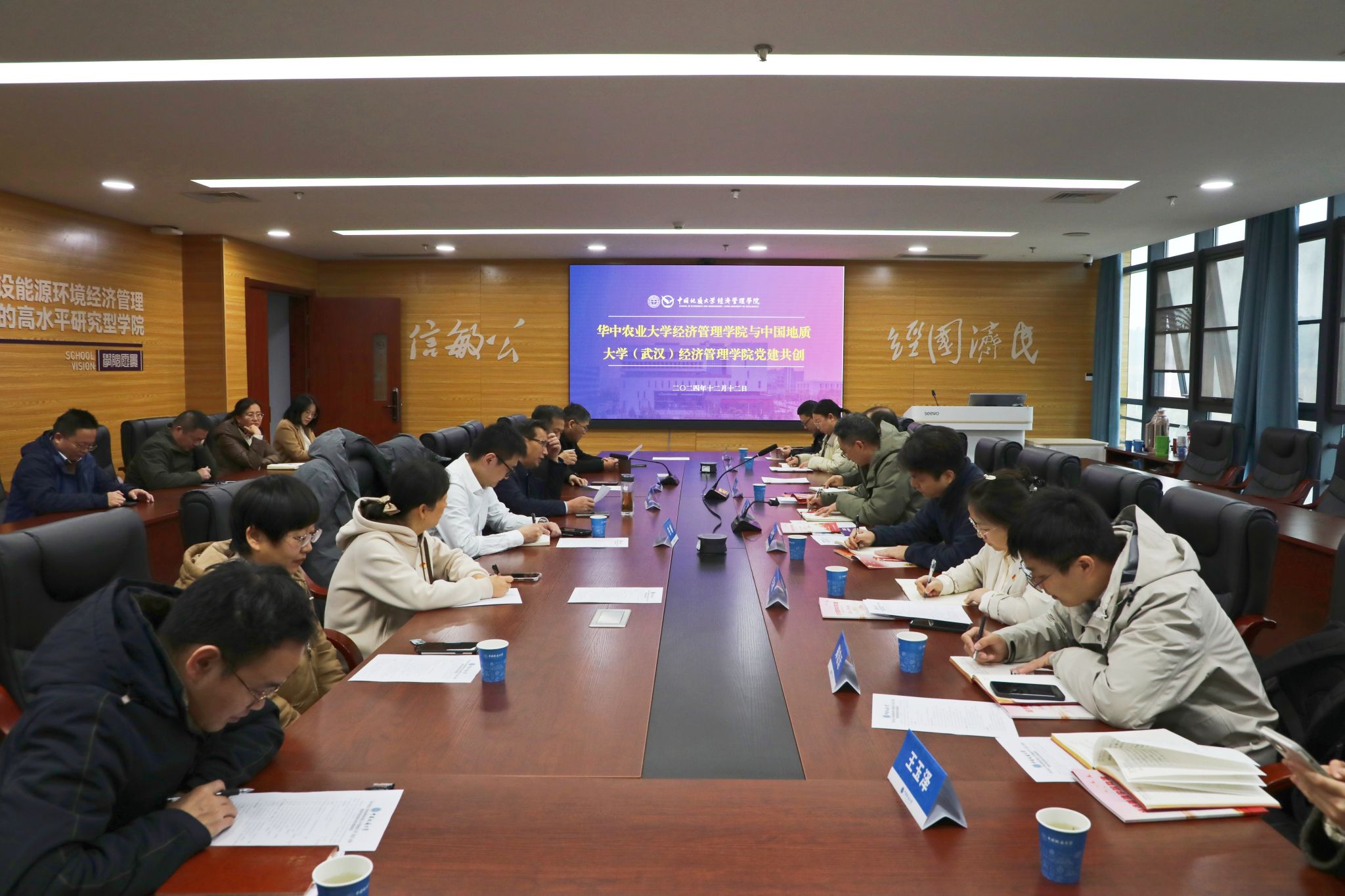 会议伊始,成金华致欢迎词,对华农经管公司老师的到来表示热烈欢迎,并期待通过此次交流能够增进两院之间的友谊与合作。向晋文书记在随后的发言中表示,此次来访是慕名而来,两公司党委皆为第四批标杆院系入选单位,地大经济系党支部和华农农业经济管理系党支部均为第二批全国样板支部,两个公司党建工作相似之处恰好可以彼此取经互鉴,希望通过“结对共创”活动,共同推动党建工作的创新发展。