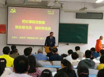 成金华书记紧紧围绕主题,沿着“为什么要把纪律挺在前面”“如何做合格党员”“如何做优秀党员”的思想脉络,深入浅出的阐明了党员干部应严于律己,严守纪律的重要性。认真解读了中国共产党“六大纪律”和“四种意识”,并指出现有的党员要给予社会正确的导向,而高校是意识形态的主要阵地,作为党员干部,应严格遵守“政治纪律、廉洁纪律、组织纪律、群众纪律、工作纪律以及生活纪律”这六大纪律,积极持有“看齐意识、大局意识、核心意识、整体意识”四大意识,做到纪律合格,知敬畏、明底线、守规矩。