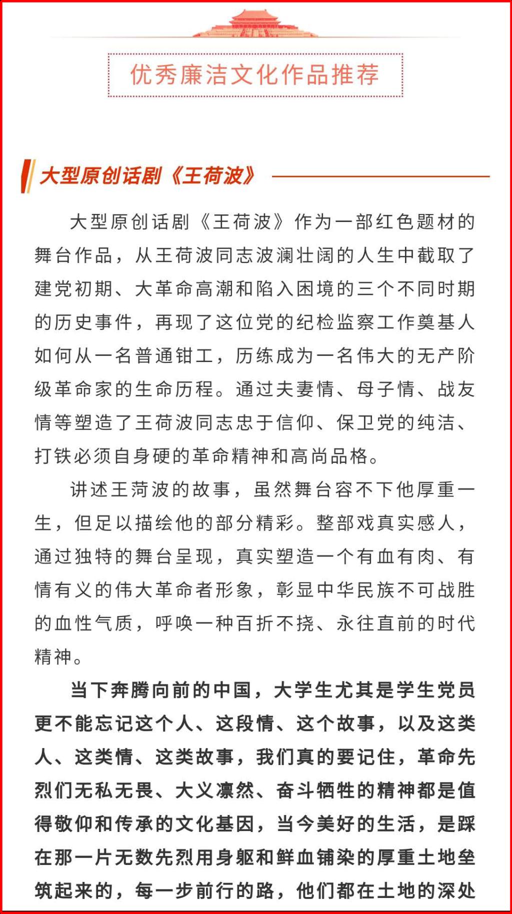 开展“以案五说”警示教育,多角度诠释党风廉政。公司依托官方微信平台,推出“党风廉政宣传教育”系列推文,深入解读《中国共产党纪律处分条例》,展示《巡视利剑》、《永远在路上》、《王荷波》、《铁血忠魂》等一批优秀廉政文化作品,以多元化的方式弘扬优秀党员的廉洁作风,以真实的案例警示员工党员正纪肃风,警示全体师生党员严格遵守党纪党规,守住纪法底线,将“廉洁”牢记于心。