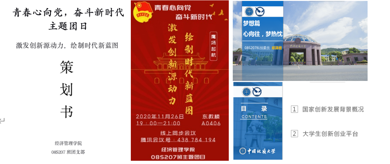 在活动策划阶段,小组成员就创新创业背景、视频素材和典型案例、地大老员工科研和创新创业实践和训练项目及其平台等广泛查找资料,并整理形成一份有关创新创业的PPT文件,存入班级QQ群文件中,供班级同学随时查阅学习。小组成员还就主题团会的流程及其组织开展向高年级085181班寻求并学习、借鉴组织主题班会的经验,相关能力在“干中学”快速获得和提升。