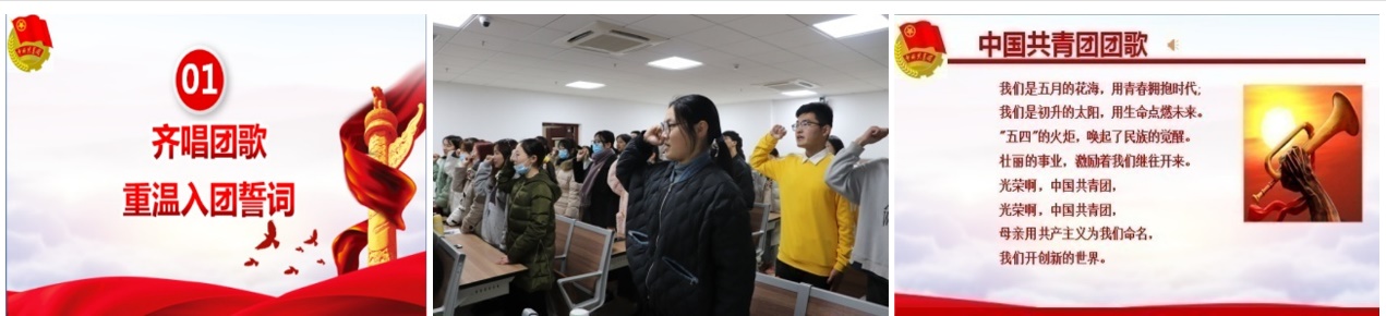 主题团日活动采取线上线下相结合方式,于预定日期2020年11月26日晚成功开展。活动在富有青春激情和梦想的团歌凑唱中开始。随后,全体团员同学在团支书王子钰同学的带领下,庄严重温入团誓词。