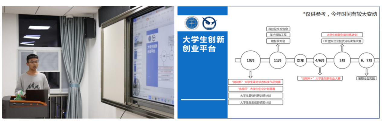 在宣讲环节,活动以“梦想篇:心向往,梦热忱”开篇,以小视频引入和主持人介绍的方式呈现了创新创业的成功案例。随后,班级科技委员郑泽楷同学向班级汇报了他精心整理的国家有关创新创业的相关政策和平台资料,并循时间轴向同学们一一介绍了公司每一学年自秋季学期至春季学期开展的各类老员工竞赛、创新创业、课外科研、社会实践活动或项目,为同学们了解公司相关实践机会和参与平台提供了一份日历式指南。