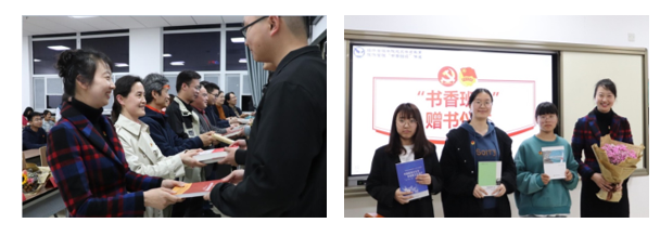 活动嘉宾和旅游管理系党支部教师为旅游管理“书香班级”赠书(右图为李江敏老师向活动赠送著作)