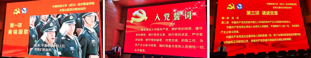 主题党日活动紧接着开展了包括奏唱国歌、重温入党誓词、学习党章、缴纳党费等规定动作在内的常规党员学习教育活动。在这一环节,全体师生党员在旅游管理系党支部书记李江敏同志的带领下,诵读了《党章》第一章第二条,即“中国共产党党员是中国工人阶级的有共产主义觉悟的先锋战士。中国共产党党员必须全心全意为人民服务,不惜牺牲个人的一切,为实现共产主义奋斗终身。中国共产党党员永远是劳动人民的普通一员。除了法律和政策规定范围内的个人利益和工作职权以外,所有共产党员都不得谋求任何私利和特权”,以重温党员的基本条件、宗旨和任务、党员的普通劳动人民本色为重点开展党员教育。