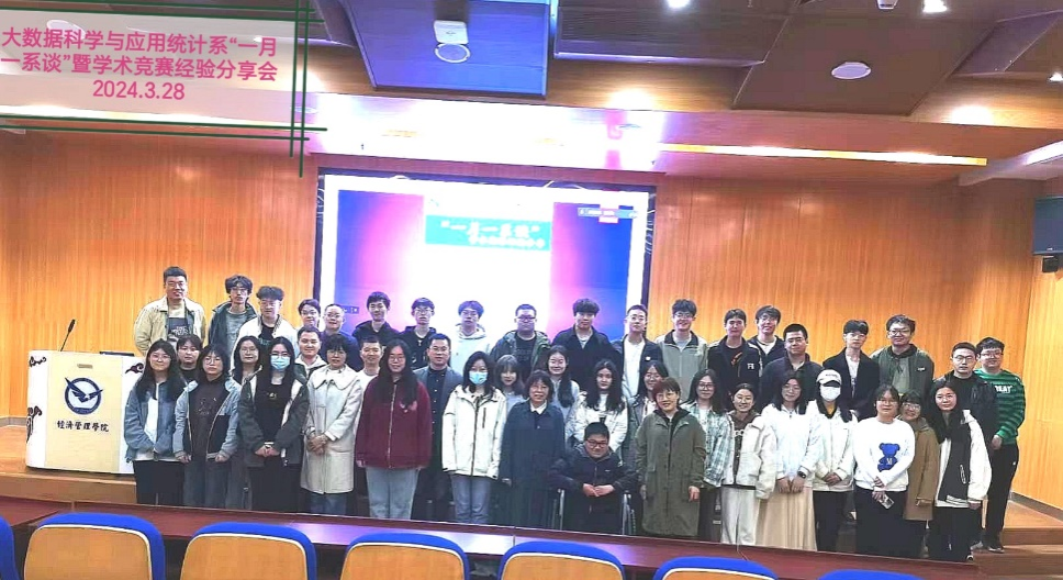 最后,老师和同学们关于统计学考研该怎么准备、参加学术竞赛通知的渠道有哪些、如何找到合适的选题等问题进行讨论。老师们鼓励同学积极参与学术竞赛,学习课堂上学不到的实际知识,促进专业理论知识与实践相结合。同时深情寄语同学们以赛带学,以赛促学;协同创新,学以致用;自信自强,奋斗不息。