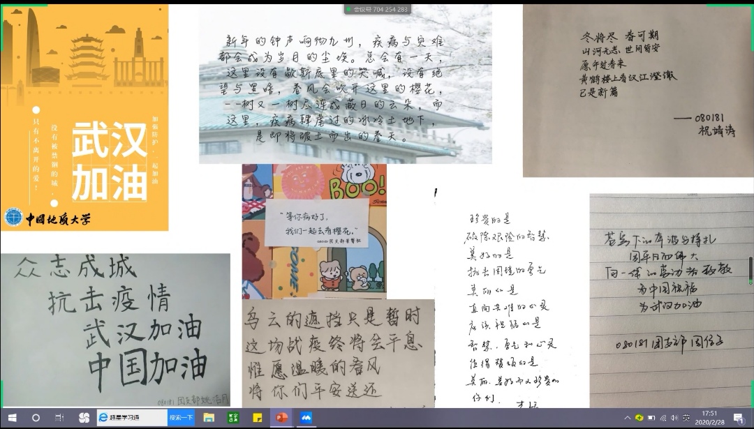 班会中,团支书刘亚旭以我们身边的校园卫士、地大员工、青年榜样的鲜活典型为例,讲述了在疫情期间默默为人民付出的事迹,让同学们引起共鸣。听从党的召唤,风雨兼程到校医院工作的刘艳华;不知姓名为公司教学楼消毒的校园卫士;拥有24年党龄的地大员工,火神山、雷神山项目后勤保障内外部总协调负责人罗飞;还有为抗击疫情贡献自己的力量的志愿者同学们和可爱的班主任刘耕老师都是我们学习的榜样。他说“有党和国家的领导,有人民群众的众志成城,我们有理由相信在不久的将来疫情就能够的得到有效的控制。”来自武汉的余佳颖、方一楠同学对疫情感受最为真切。她们分别向大家分享了身在武汉的生活感受,以及讲述了受抗击疫情前线的妈妈的影响,在社区担任志愿者的故事。