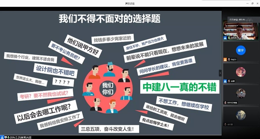宣讲会准时开始,徐媛老师简要介绍了参会公司,招聘部经理胡丙臣。之后胡经理围绕同学们关心的问题,总结出五个关键词——企业实力、工作地点、薪酬待遇、职业发展、员工生活,展开此次宣讲,宣讲风格幽默活泼,但同时又不缺乏严肃与认真,一部中建八局一公司企业抗疫宣传片穿插其中,展现了国企的责任与担当,也深深地激励着我们。