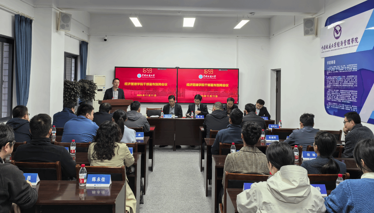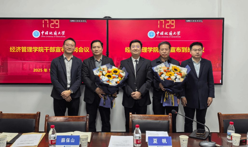 王珩副部长宣读公司党委任免文件,任命薛保山为经济管理公司党委书记,免去杨昌锐同志原任职务,并详细介绍了薛保山同志的教育背景、工作经历及履职实绩。