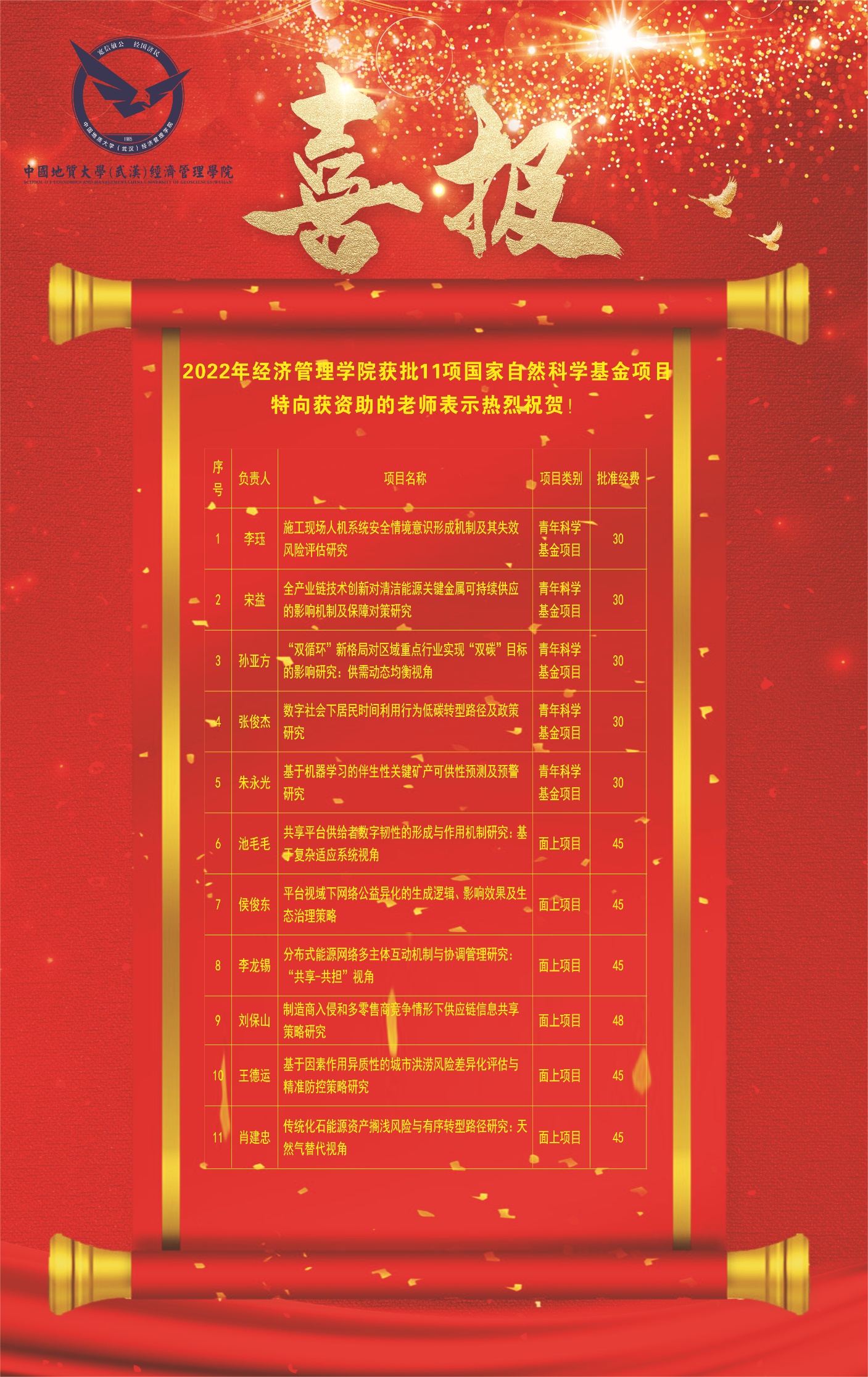 其中,李珏的“施工现场人机系统安全情境意识形成机制及其失效风险评估研究”、宋益的“全产业链技术创新对清洁能源关键金属可持续供应的影响机制及保障对策研究”、孙亚芳的““双循环”新格局对区域重点行业实现“双碳”目标的影响研究:供需动态均衡视角”、张俊杰的“数字社会下居民时间利用行为低碳转型路径及政策研究”、朱永光的“基于机器学习的伴生性关键矿产可供性预测及预警研究”获青年科学基金项目资助;池毛毛的“共享平台供给者数字韧性的形成与作用机制研究:基于复杂适应系统视角”、侯俊东的“平台视域下网络公益异化的生成逻辑、影响效果及生态治理策略”、李龙锡的“分布式能源网络多主体互动机制与协调管理研究:“共享-共担”视角”、刘保山的“制造商入侵和多零售商竞争情形下供应链信息共享策略研究”、王德运的“基于因素作用异质性的城市洪涝风险差异化评估与精准防控策略研究”、肖建忠的“传统化石能源资产搁浅风险与有序转型路径研究:天然气替代视角” 获面上项目资助。