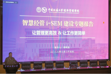 郭明晶信息委员作“智慧经管”建设与使用报告。他从建设目标、建设思路、功能设计、预期效果对i-SEM“智慧经管”信息系统建设情况做了专题介绍。